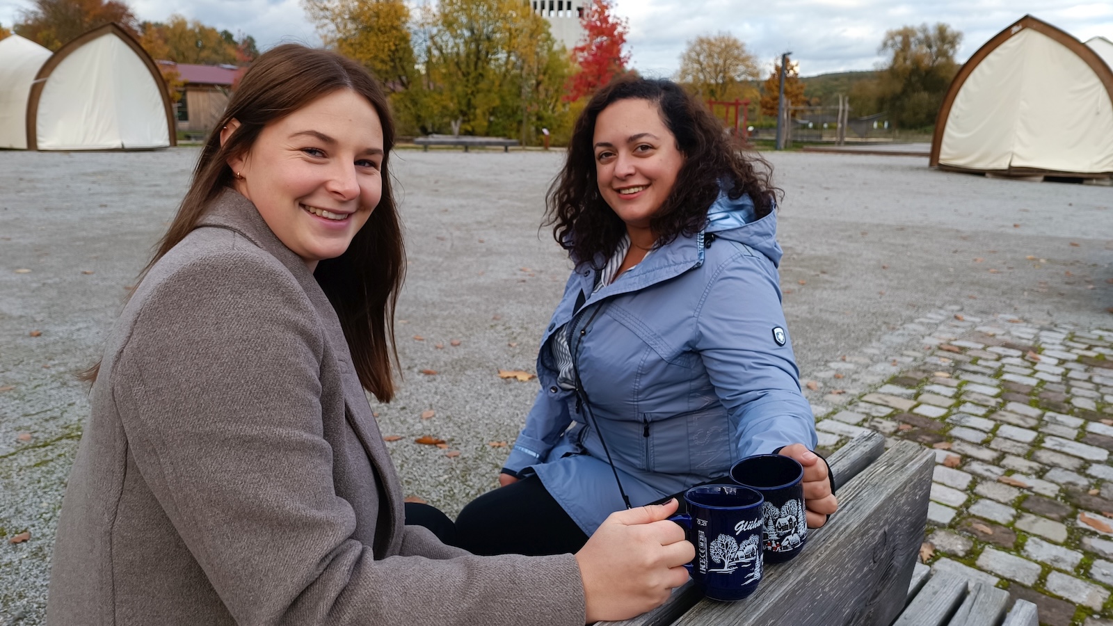 Madita Alberding und Gizem Cevik vom Huxarium freuen sich auf einen heißen Glühwein beim Gartenparkzauber am 16. November. Der Eventplatz wird dann stimmungsvoll geschmückt sein. Vier Aussteller werden in den Zelten ringsum weihnachtliche Deko zum Verkauf anbieten.