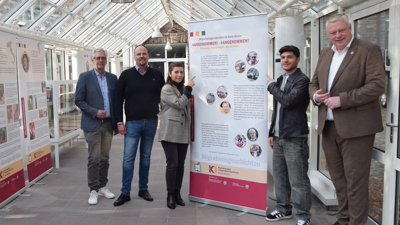 Die Wanderausstellung ‚Migrationsgeschichten im Kreis Höxter‘ ist noch bis Ende Oktober im Glasgang des Stadthauses Höxter zu sehen und macht persönliche Lebenswege von Gastarbeiterfamilien sichtbar. (v.l.) Dezernent Stefan Fellmann (Stadt Höxter), Abteilungsleiter Dominic Gehle (Kreis Höxter), Nursen Eliyazici (Kommunales Integrationszentrum), Enes Eliyazici (Enkel von Ali Karaca, dessen Lebensgeschichte in der Ausstellung gezeigt wird) und Bürgermeister Daniel Hartmann.