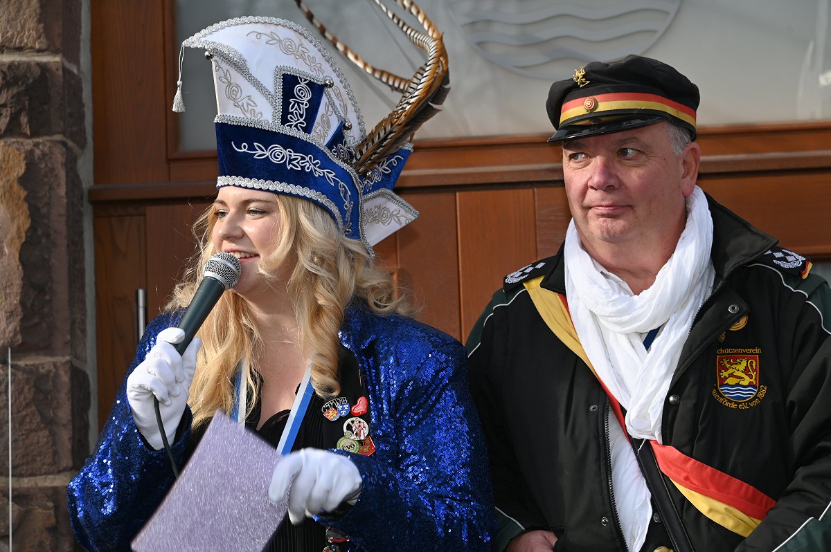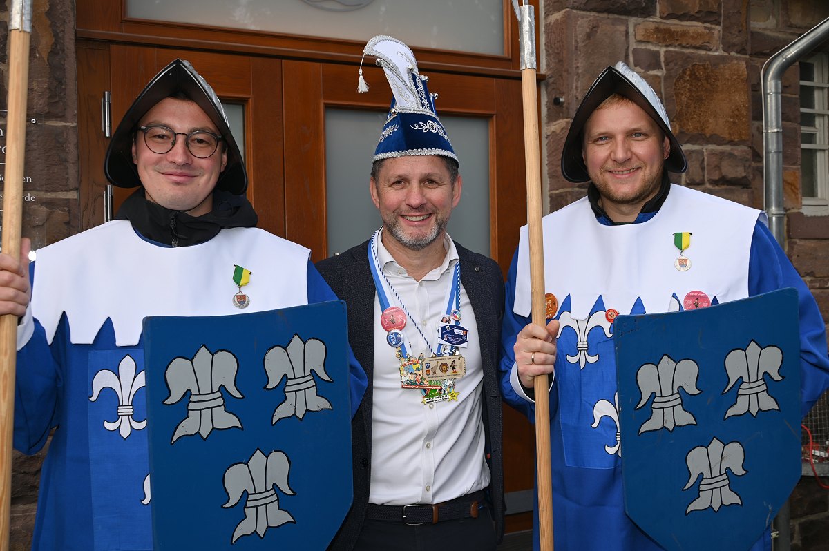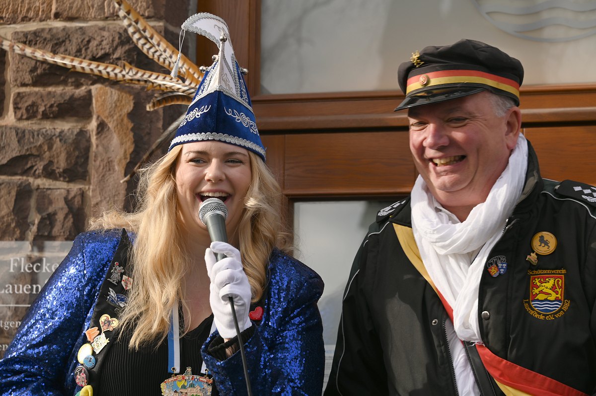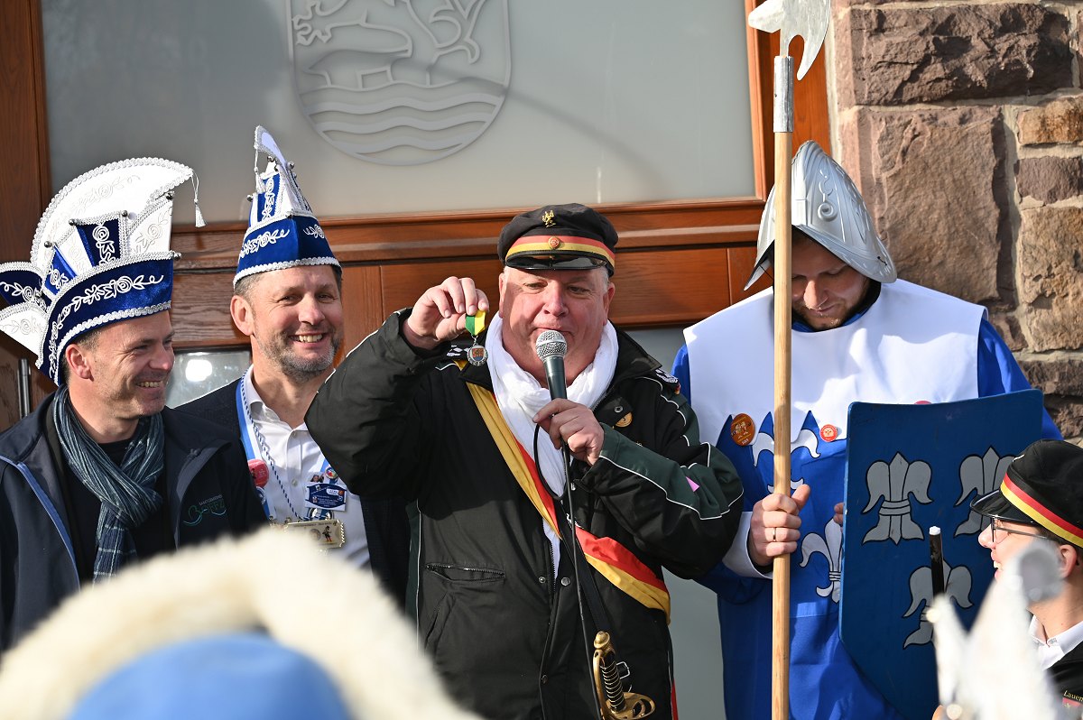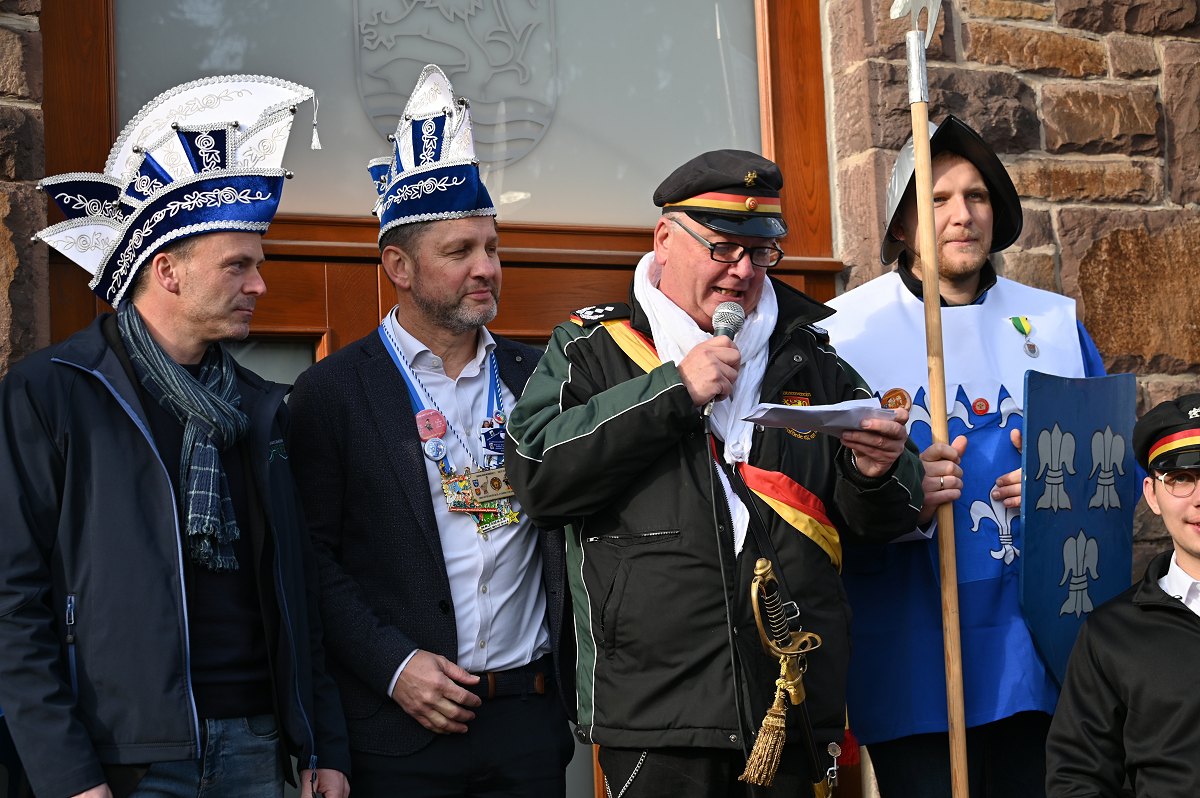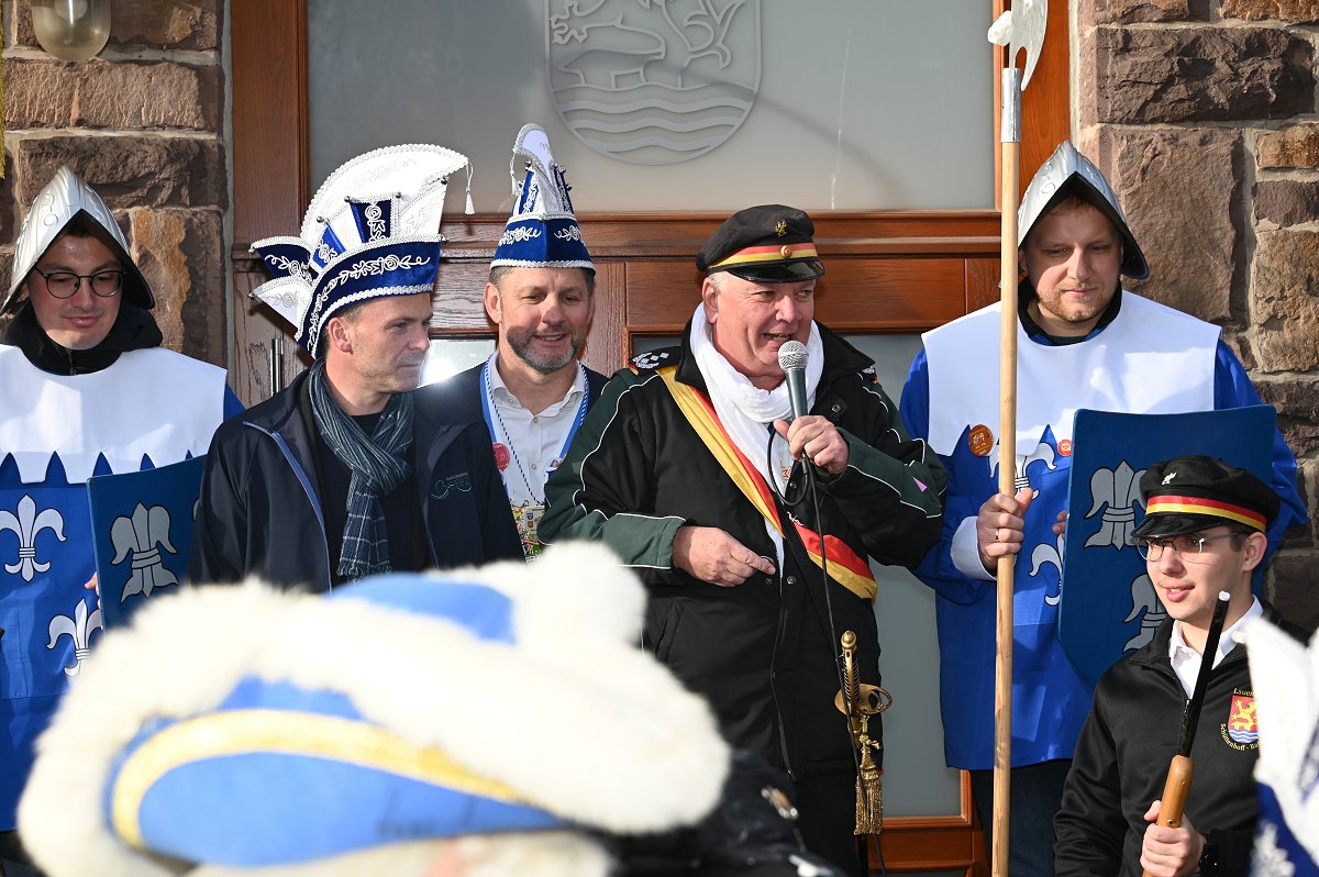 Doch die Jecken waren vorbereitet: Zunächst stürmten die Damen der blau-weißen Garde voran und setzten mit Konfetti-Kanonen bunte Akzente. Danach rückten die Damen der alten Garde mit Regenschirmen an, ein ungewöhnliches, aber wirkungsvolles Bild. Schließlich ebneten die männlichen Karnevalisten in einem geschickten Überraschungsmanöver den Weg, indem sie den Schlagbaum kurzerhand beiseiteschoben. Damit war die Verteidigungslinie gebrochen und die Narrenschar konnte triumphierend ins Rathaus einziehen. Erstmals hatten die Lauenförder Schützen auch Unterstützung aus Beverungen: Zwei Burgwächter, persönlich durch den neu gewählten Beverunger Bürgermeister Tino Wenkel motiviert, stellten sich gemeinsam mit den Schützen den feierlustigen Jecken entgegen. Doch auch diese Verstärkung konnte das Unvermeidliche nicht verhindern, die närrische Macht siegte. CVWB-Präsident Daniel Zarnitz zeigte sich stolz: „Besser könnte unsere Jubiläumssession nicht beginnen!“ Doch der Tag war damit längst nicht vorbei: Bereits am Nachmittag folgte in Beverungen der nächste Höhepunkt. Auf dem Kellerplatz startete ab 15 Uhr ein buntes Treiben mit viel Programm und als Höhepunkt der Proklamierung der beiden Jubiläums-Prinzenpaare ab 17:11 Uhr.