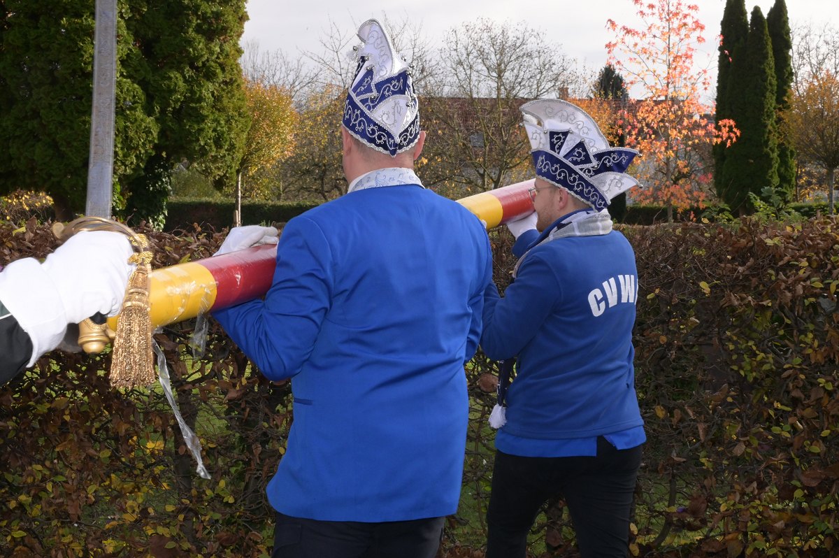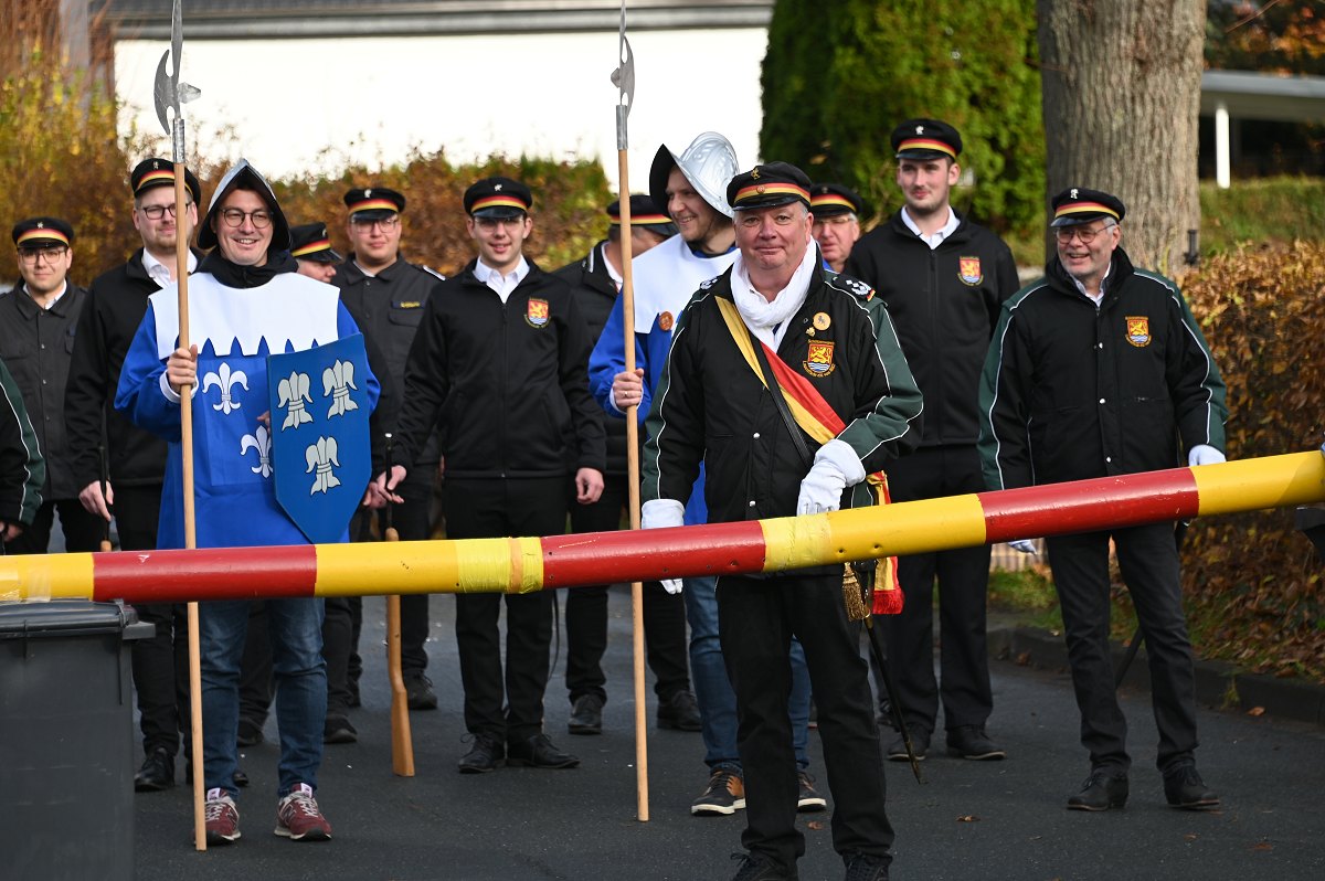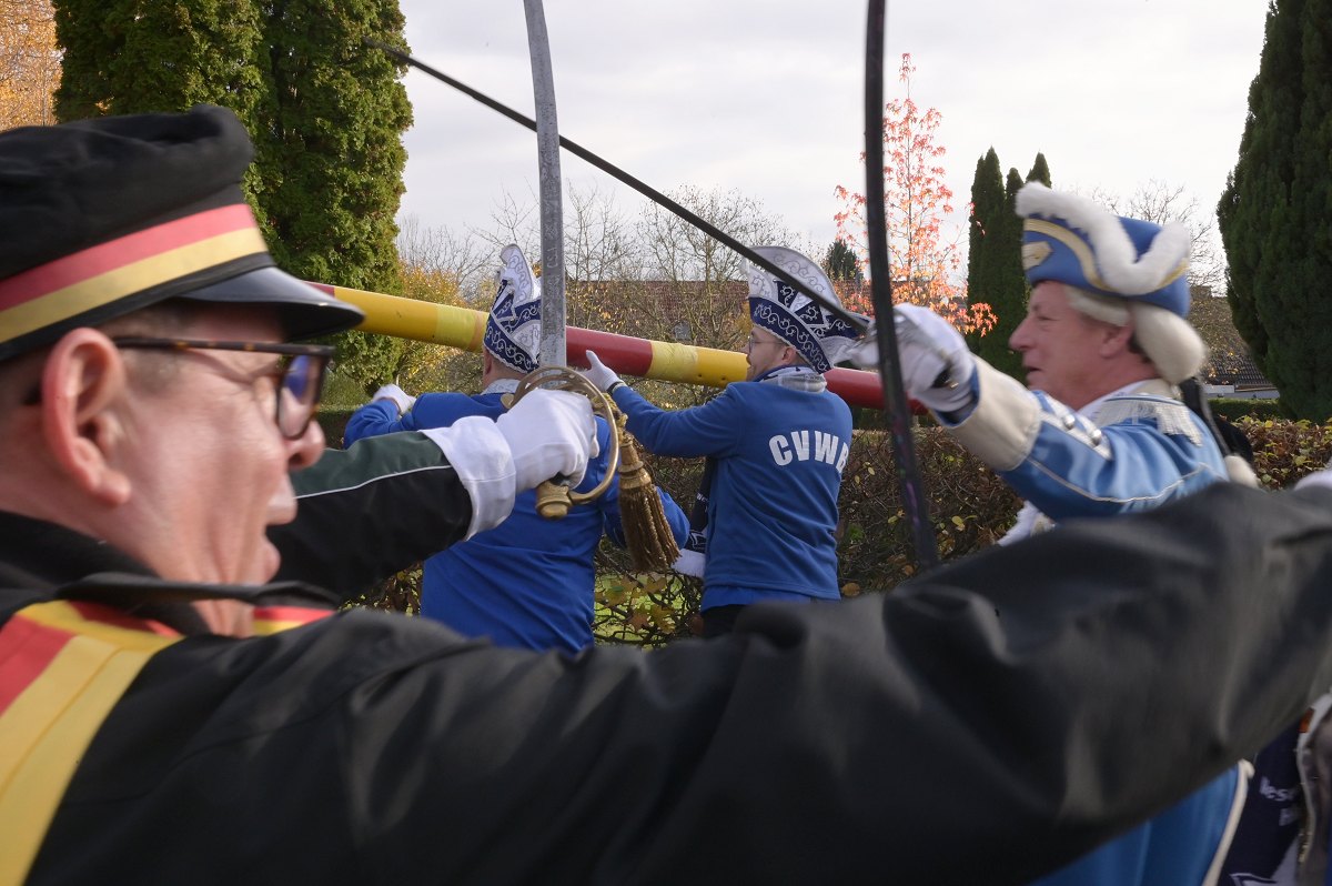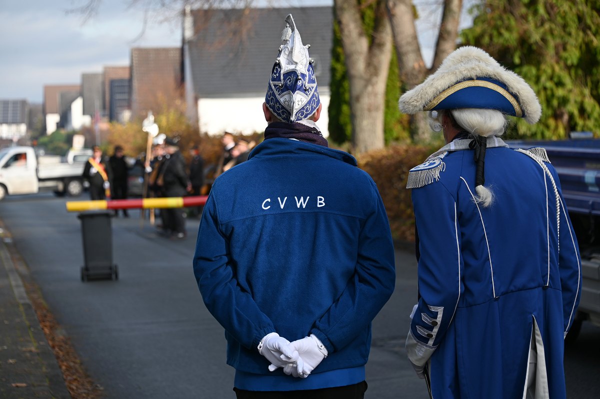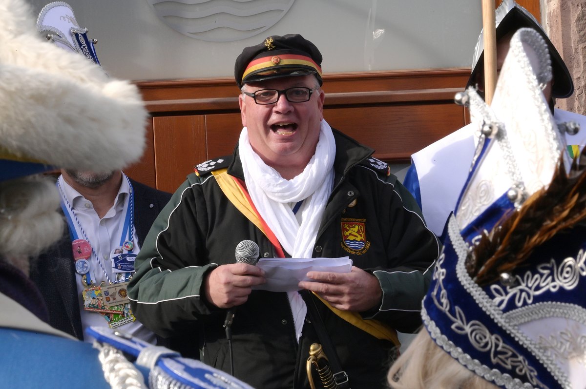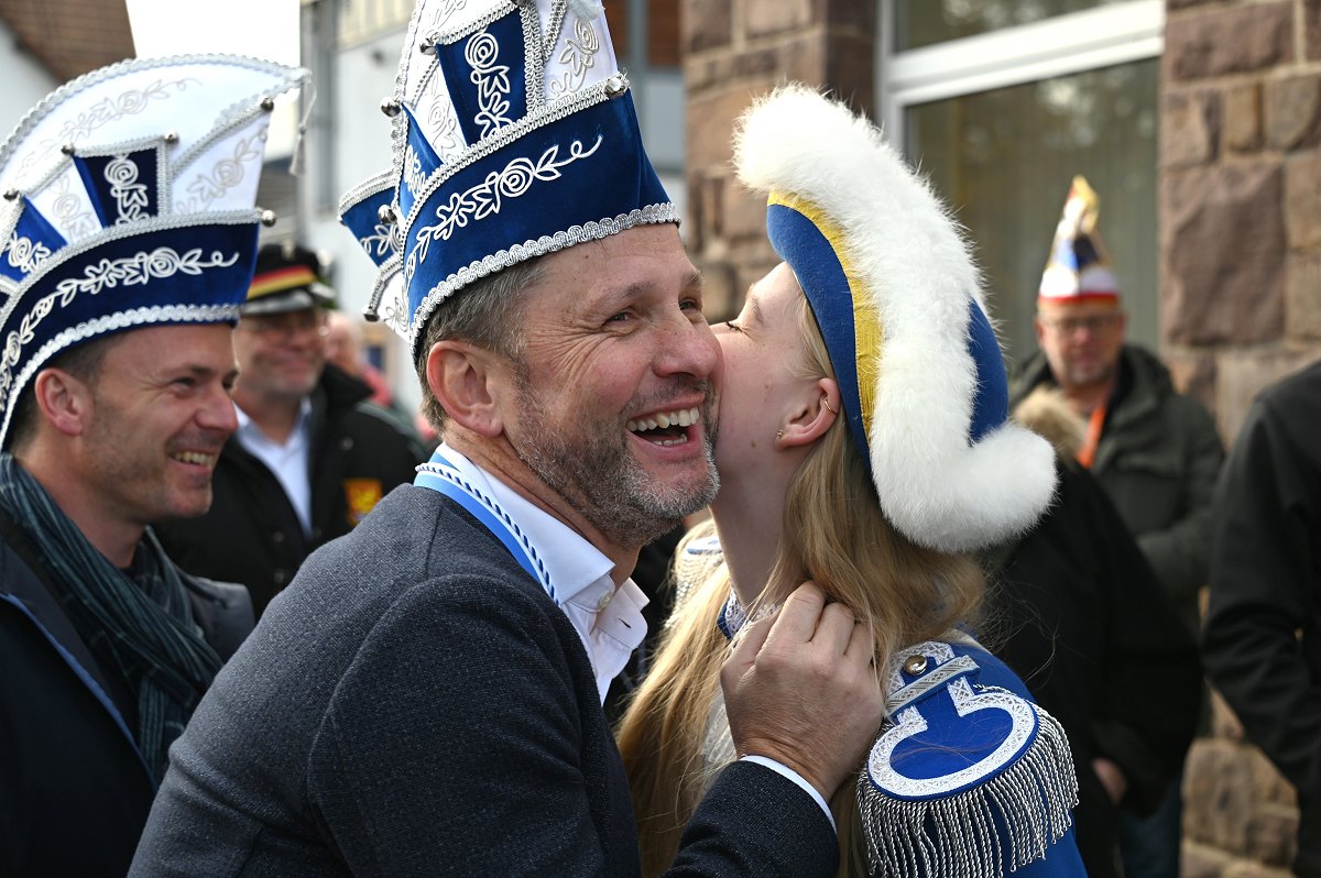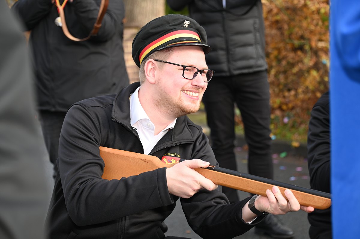 Doch die Jecken waren vorbereitet: Zunächst stürmten die Damen der blau-weißen Garde voran und setzten mit Konfetti-Kanonen bunte Akzente. Danach rückten die Damen der alten Garde mit Regenschirmen an, ein ungewöhnliches, aber wirkungsvolles Bild. Schließlich ebneten die männlichen Karnevalisten in einem geschickten Überraschungsmanöver den Weg, indem sie den Schlagbaum kurzerhand beiseiteschoben. Damit war die Verteidigungslinie gebrochen und die Narrenschar konnte triumphierend ins Rathaus einziehen. Erstmals hatten die Lauenförder Schützen auch Unterstützung aus Beverungen: Zwei Burgwächter, persönlich durch den neu gewählten Beverunger Bürgermeister Tino Wenkel motiviert, stellten sich gemeinsam mit den Schützen den feierlustigen Jecken entgegen. Doch auch diese Verstärkung konnte das Unvermeidliche nicht verhindern, die närrische Macht siegte. CVWB-Präsident Daniel Zarnitz zeigte sich stolz: „Besser könnte unsere Jubiläumssession nicht beginnen!“ Doch der Tag war damit längst nicht vorbei: Bereits am Nachmittag folgte in Beverungen der nächste Höhepunkt. Auf dem Kellerplatz startete ab 15 Uhr ein buntes Treiben mit viel Programm und als Höhepunkt der Proklamierung der beiden Jubiläums-Prinzenpaare ab 17:11 Uhr.