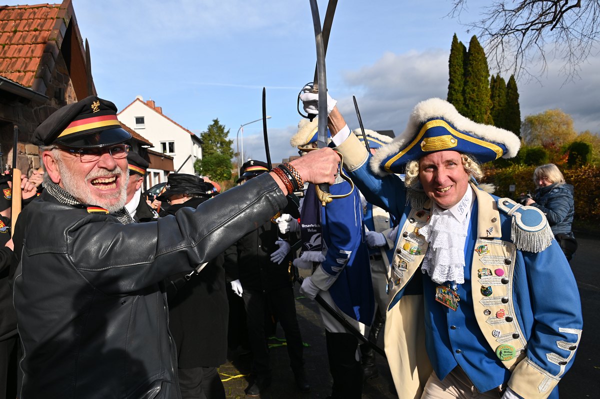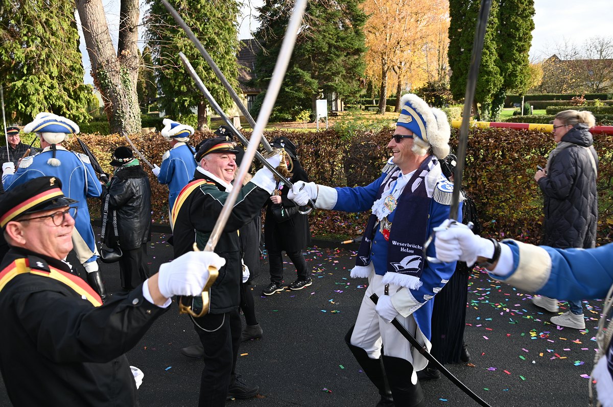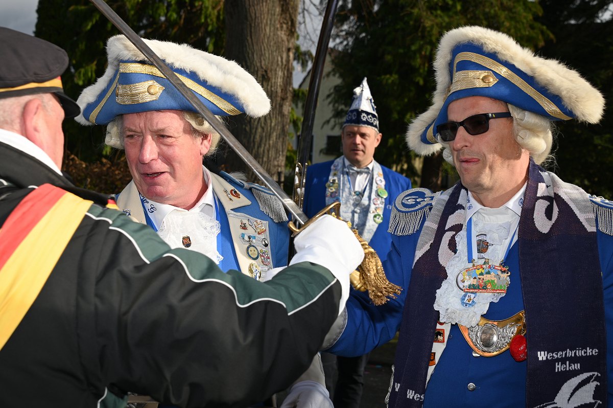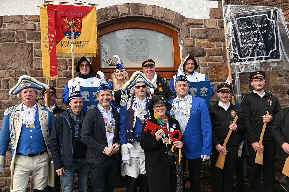 Kreis Holzminden/Höxter (TKu). Wo könnte die närrische Zeit in den Kreisen Holzminden und Höxter besser starten als genau dort, wo Niedersachsen und Nordrhein-Westfalen aufeinandertreffen? Passenderweise fiel der Start in die fünfte Jahreszeit am „Elften im Elften“ um exakt 11:11 Uhr auch dieses Jahr wieder auf die Landesgrenze und das mit einem besonderen Anlass: Der Carnevalsverein Weserbrücke e.V. (CVWB) feiert sein 50-jähriges Vereinsjubiläum. Unter dem Motto „Der CVWB glitzert grenzenlos – im Dreiländereck ist richtig was los!“ erlebten zahlreiche Närrinnen und Narren einen Auftakt, der ausgelassener kaum sein könnte. Die Jecken aus Beverungen und Lauenförde ließen es sich nicht nehmen, traditionsgemäß den Schlüssel zum Roten Rathaus in Lauenförde zu ergattern und das Rathaus zu erstürmen. Und obwohl die Wächter des Schützenvereins Lauenförde von 1882 e.V. mit viel Energie und einer ganzen Verteidigungsstrategie anrückten, war der Sieg der Carnevalisten am Ende schon wieder unausweichlich. Der Vorsitzende des Schützenvereins, Werner Tyrasa, hatte erneut große Töne gespuckt und war fest entschlossen, das Rathaus gegen jede närrische Übermacht zu verteidigen. Eine schwere Kanone, eine kleine Schützen-Armee mit Gewehren und ein „massiver“ Schlagbaum sollten den Vormarsch der Karnevalisten verhindern.