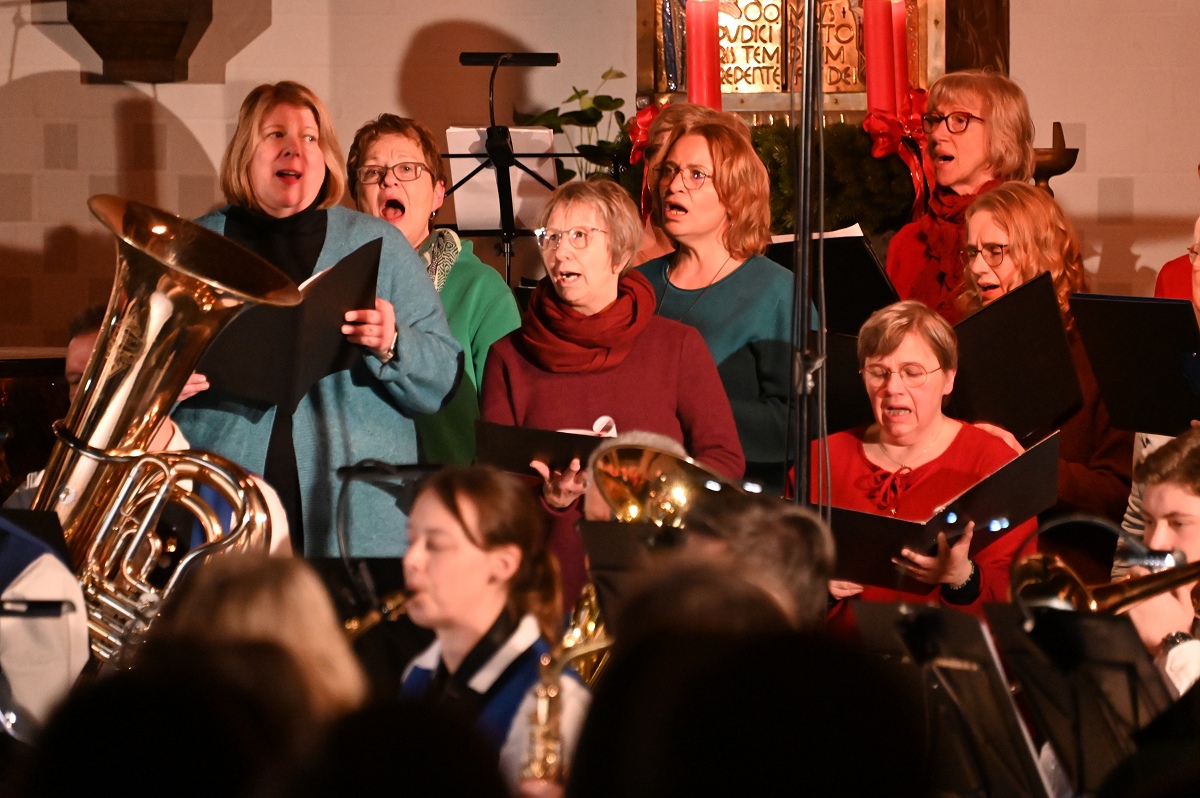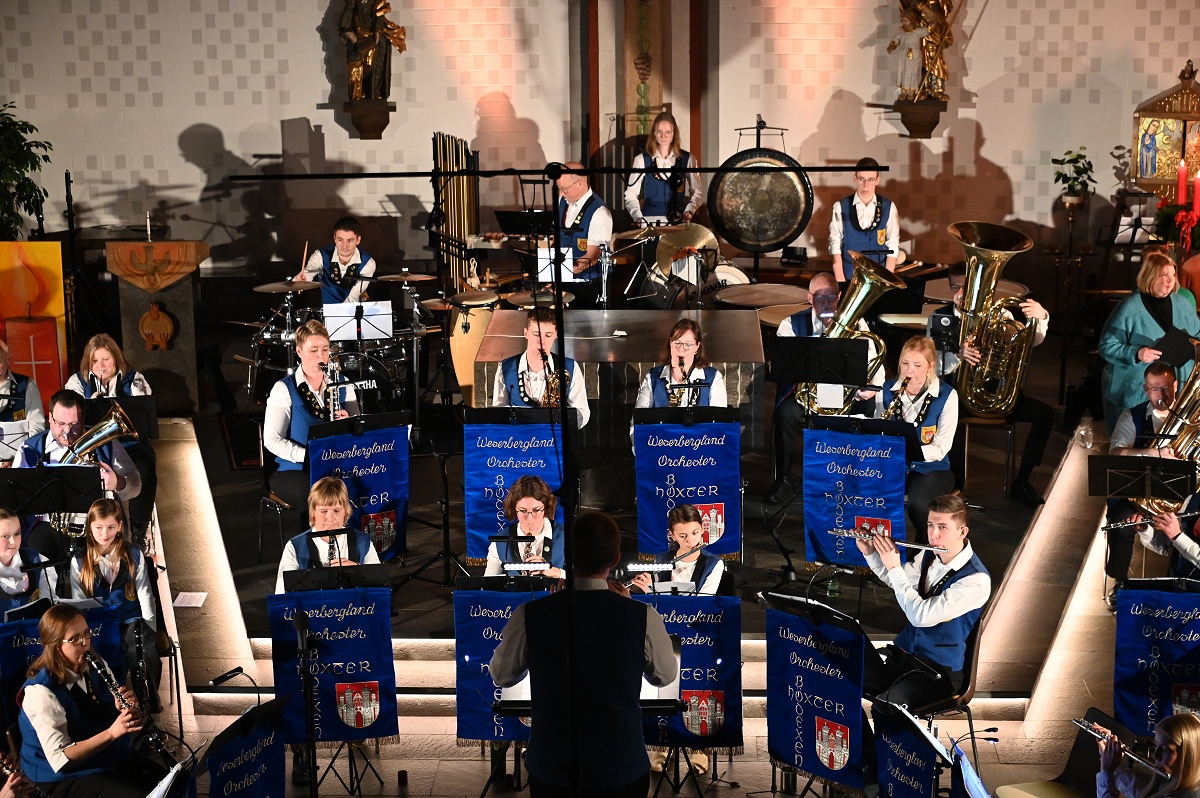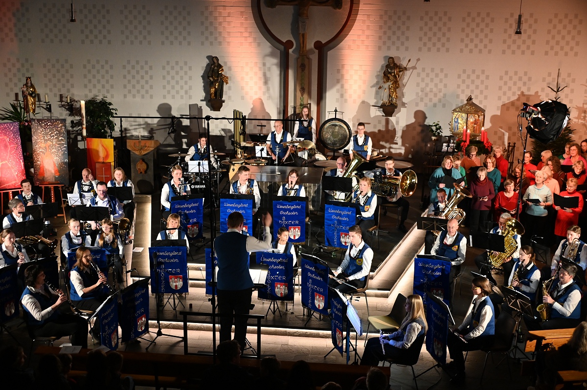 Kreis Höxter/Bödexen (TKu). Mehr als 100 Musikerinnen und Musiker aus dem Kreis Höxter sowie über 350 Zuhörerinnen und Zuhörer haben das Weihnachtskonzert des Projekts „Einklang“ zu einem vorweihnachtlichen Höhepunkt im Kreis Höxter gemacht. In der bis auf den letzten Sitzplatz gefüllten St.-Anna-Kirche in Bödexen herrschte eine besondere Atmosphäre: Es wurde mitgesungen, mitgeklatscht und am Ende dankte das Publikum den Mitwirkenden mit lang anhaltendem Applaus und Standing Ovations. Das Konzert war zugleich der erfolgreiche Abschluss eines außergewöhnlichen Musikprojekts im Kreis Höxter, das viele unterschiedliche Menschen zusammengebracht hat. Mit dem zweiten Konzert am vergangenen Sonntag in Bödexen ging das „Projekt Einklang“ offiziell zu Ende. Bereits eine Woche zuvor, am 6. Dezember, hatte das 100-köpfige Ensemble im Rahmen des Weihnachtsmarktes in der Fürstenauer St.-Anna-Kirche ihren ersten Auftritt. Beide Konzerte zeigten, was entstehen kann, wenn musikalisches Engagement, Offenheit und Gemeinschaftsgeist aufeinandertreffen. Über 60 Sängerinnen und Sänger aus dem gesamten Kreis Höxter standen gemeinsam mit dem Weserberglandorchester (WBO) aus Bödexen auf der Kirchenbühne und präsentierten ein abwechslungsreiches und stimmungsvolles Programm.