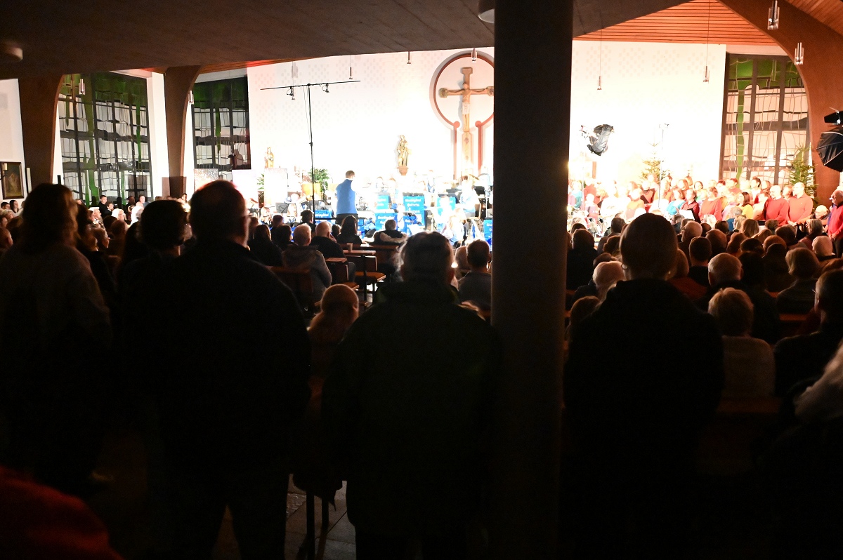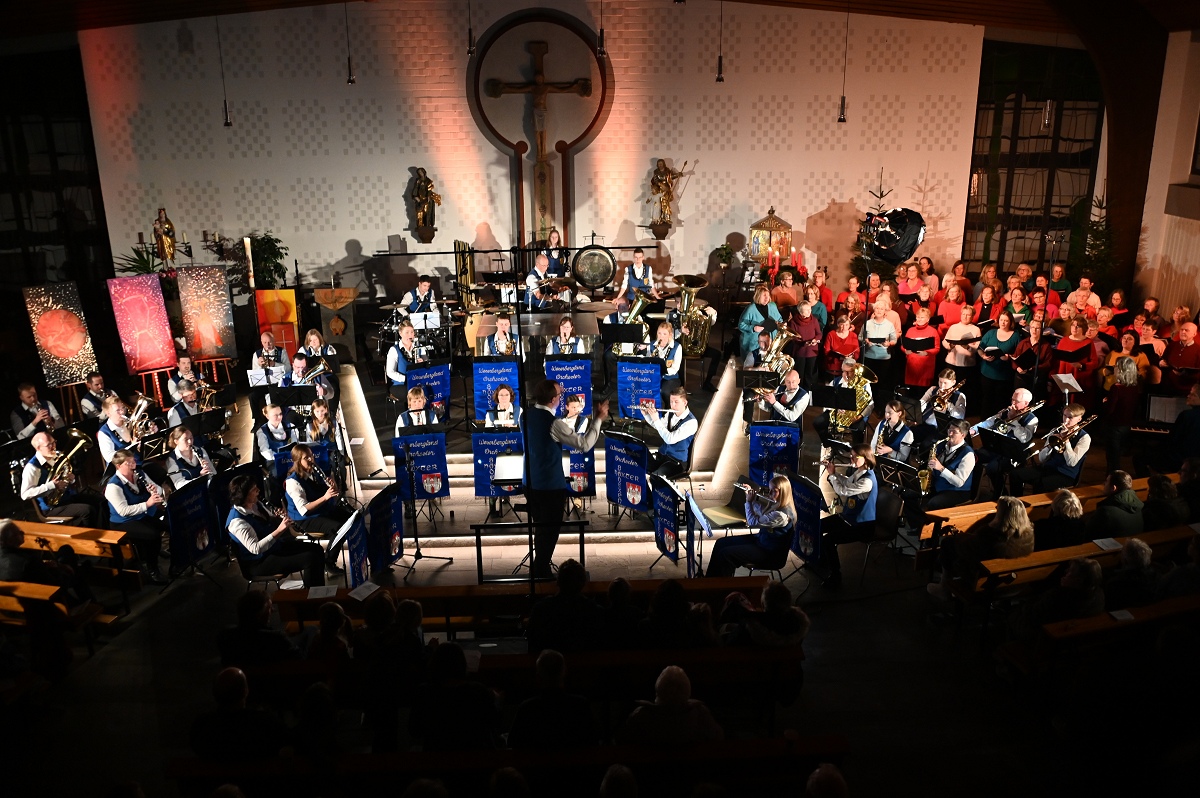 Die musikalische Bandbreite reichte von klassischen Stücken bis hin zu modernen Weihnachts- und Popliedern. Auf dem Programm standen unter anderem „Ode an die Freude“, „Jingle Bells“, „Little Drummer Boy“, „All I Want for Christmas“ und „Fairytale of New York“. Ergänzt wurde das Repertoire durch Titel wie „Kinder tragen Licht ins Dunkel“ und „Welt in Farbe“, die den inhaltlichen Kern des Projekts widerspiegelten: Hoffnung, Zusammenhalt und Vielfalt. Immer wieder sprang die Begeisterung der Musikerinnen und Musiker auf das Publikum über, das aktiv in das Konzertgeschehen eingebunden war. Ein besonderer emotionaler Höhepunkt waren die Auftritte von 20 Kindern aus der musikalischen Früherziehung. Die jungen Teilnehmerinnen und Teilnehmer aus dem Projekt „Engagiert(e) unter einem Dach“ sowie Schülerinnen und Schüler der Bläserklassen zeigten selbstbewusst ihr Können und wurden vom Publikum mit großem Applaus belohnt. Ihr Auftritt machte deutlich, wie wichtig frühzeitige musikalische Bildung ist und welchen Stellenwert die Nachwuchsarbeit innerhalb von „Projekt Einklang“ hatte.