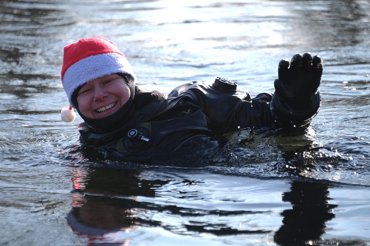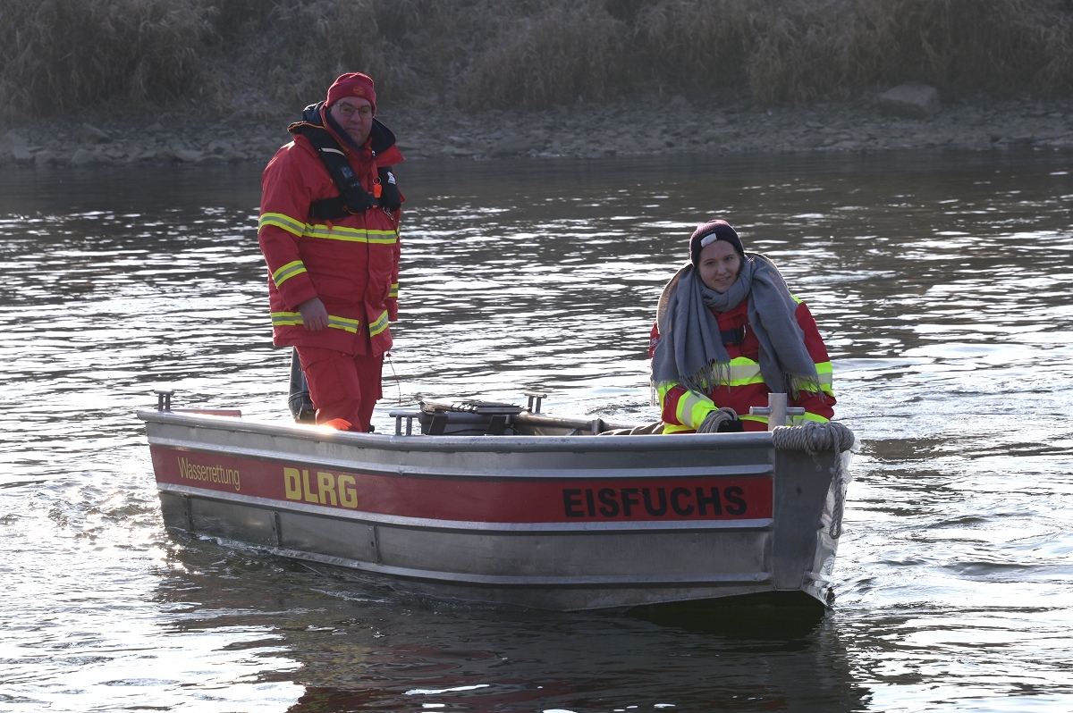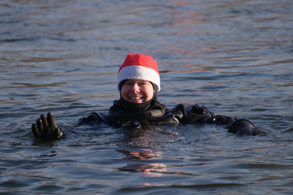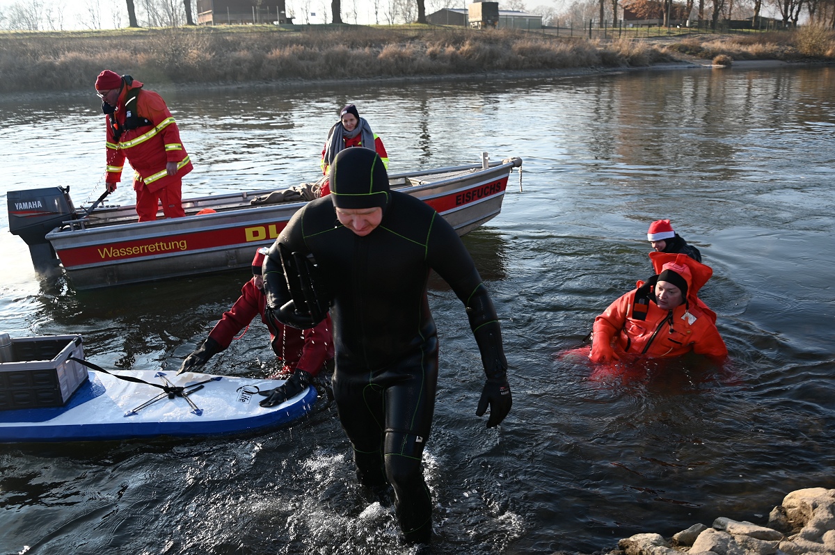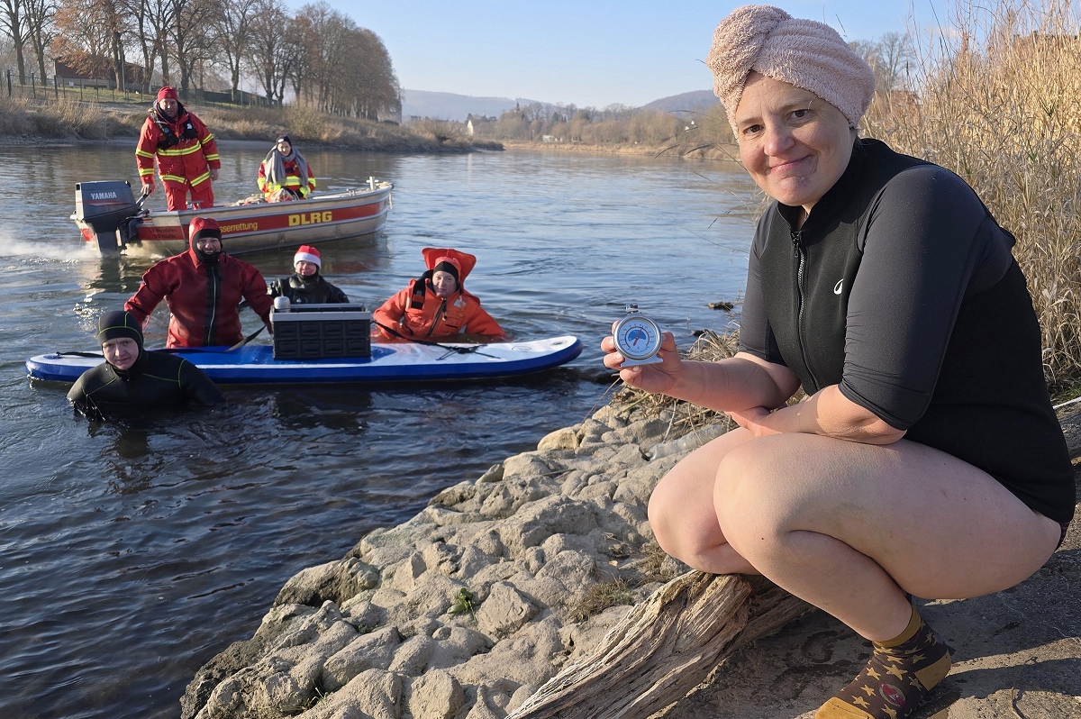 Aus dem Wasser heraus riefen die Weihnachtsschwimmer den Menschen „Frohe Weihnachten“ zu und die Grüße wurden immer herzlich erwidert. Überall auf dem Weg waren sie außerdem ein beliebtes Fotomotiv. Als die Gruppe am Pier 1 in Höxter vorbeitrieb, wurden sehr viele Gäste dabei beobachtet, wie sie von ihrem Platz aufstanden, ihre Handys zückten und das Spektakel fotografisch festhielten. Die weiteste Anreise von den Schwimmenden hatte Jens Wolff aus Nürnberg, der als Gast mit in die Weser stieg. Es sei nicht sein erstes Mal gewesen, meint der gebürtige Höxteraner, aber der lange Weg lohne sich immer wieder dafür, um die Weser in Höxter zu bezwingen. Trotz oder gerade wegen der niedrigen Temperaturen von etwa minus zwei Grad Celsius Außentemperatur zeigte sich Rettungsschwimmer Stefan Bergmann sehr zufrieden: „Es war zwar sehr kalt, aber weil es windstill war und zugleich die Sonne schien, ließ es sich im Wasser gut aushalten.“ Nicht ganz bis zum Zielpunkt schaffte es jedoch Schwimmerin Dörte Dewies. Ein paar hundert Meter vor dem Ausstiegspunkt habe sie aufgeben und sich mit dem Rettungsboot bis zur Weserscholle transportieren lassen müssen. „Meine Füße waren einfach zu durchgefroren“, erklärte sie nach dem Ausstieg. Aber es sei dennoch auch sehr schön gewesen, so die hartgesottene Rettungsschwimmerin Dörte Dewies. Zeitweise habe man in der Weser gut stehen können und das Wasser sei sehr klar gewesen an vielen Stellen am Rand, wo man den Grund sehen konnte.