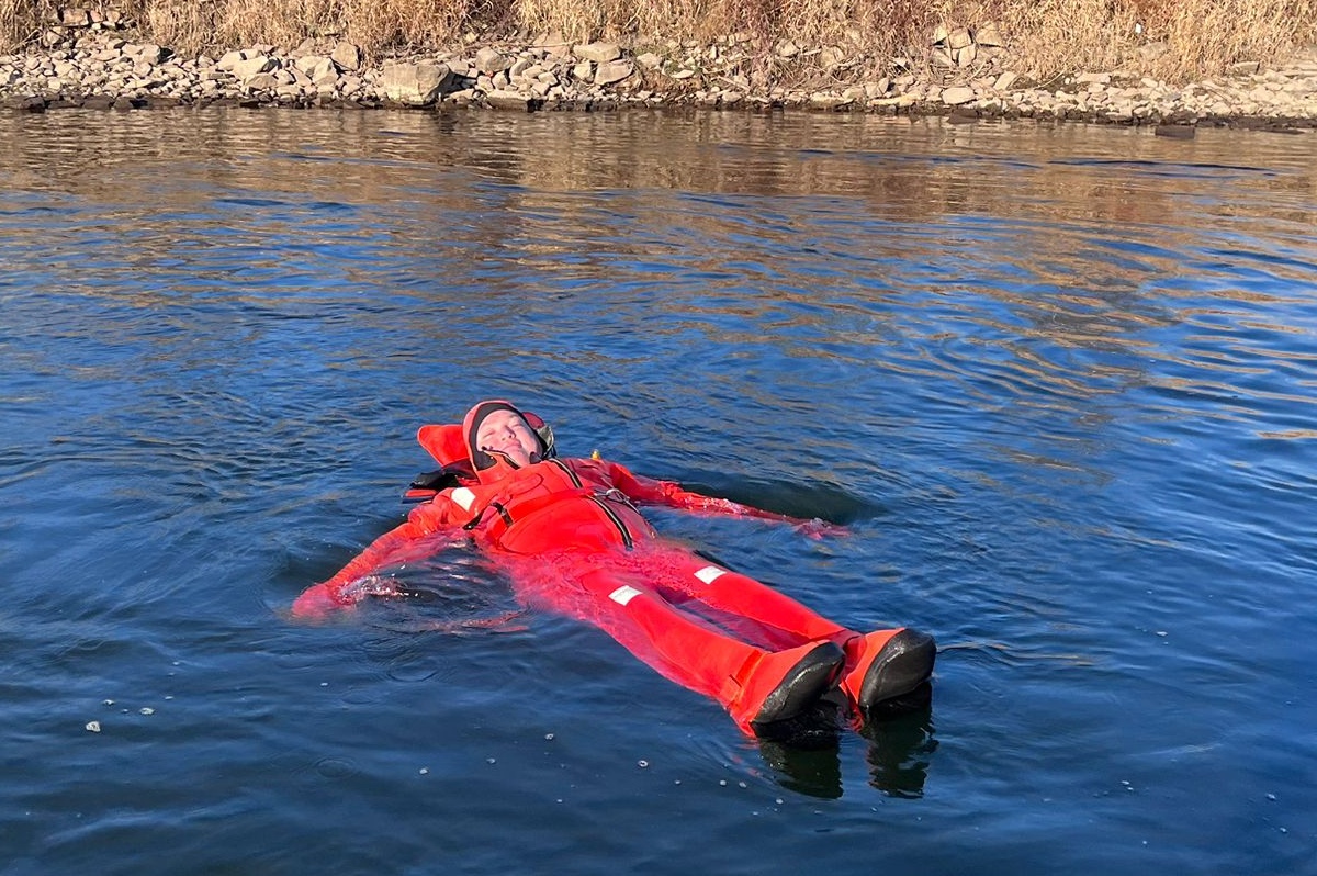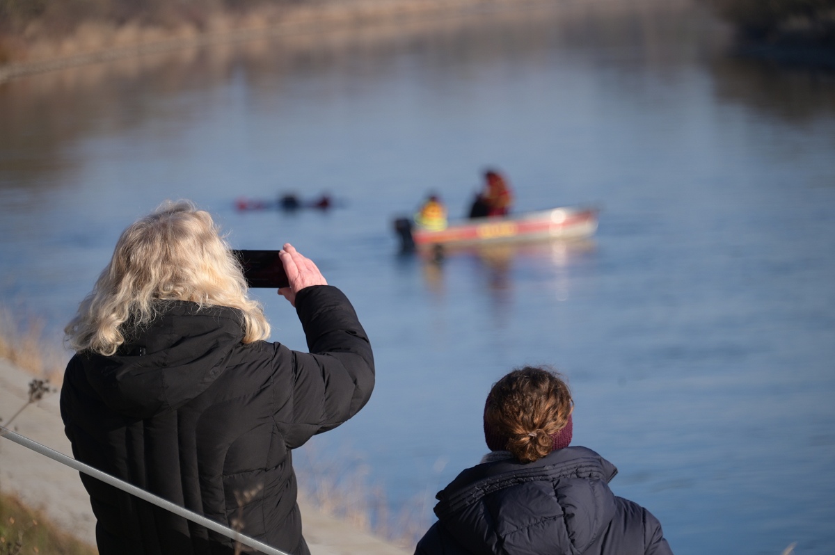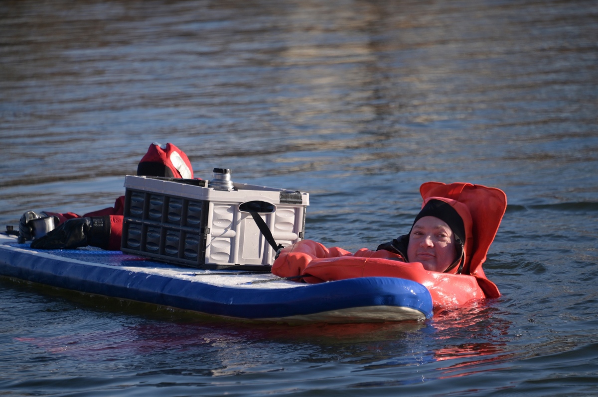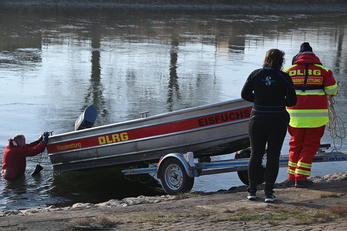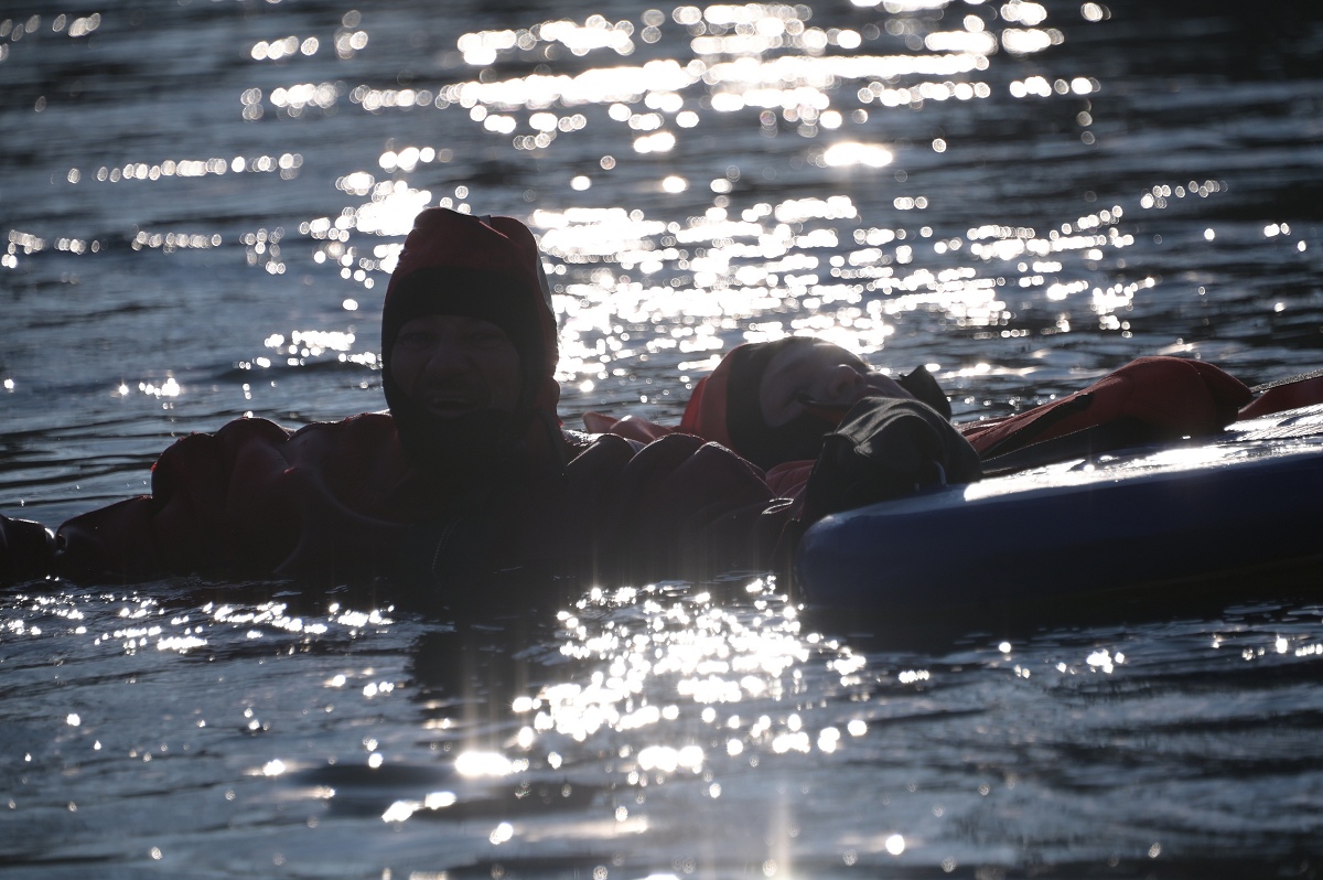 Aus dem Wasser heraus riefen die Weihnachtsschwimmer den Menschen „Frohe Weihnachten“ zu und die Grüße wurden immer herzlich erwidert. Überall auf dem Weg waren sie außerdem ein beliebtes Fotomotiv. Als die Gruppe am Pier 1 in Höxter vorbeitrieb, wurden sehr viele Gäste dabei beobachtet, wie sie von ihrem Platz aufstanden, ihre Handys zückten und das Spektakel fotografisch festhielten. Die weiteste Anreise von den Schwimmenden hatte Jens Wolff aus Nürnberg, der als Gast mit in die Weser stieg. Es sei nicht sein erstes Mal gewesen, meint der gebürtige Höxteraner, aber der lange Weg lohne sich immer wieder dafür, um die Weser in Höxter zu bezwingen. Trotz oder gerade wegen der niedrigen Temperaturen von etwa minus zwei Grad Celsius Außentemperatur zeigte sich Rettungsschwimmer Stefan Bergmann sehr zufrieden: „Es war zwar sehr kalt, aber weil es windstill war und zugleich die Sonne schien, ließ es sich im Wasser gut aushalten.“ Nicht ganz bis zum Zielpunkt schaffte es jedoch Schwimmerin Dörte Dewies. Ein paar hundert Meter vor dem Ausstiegspunkt habe sie aufgeben und sich mit dem Rettungsboot bis zur Weserscholle transportieren lassen müssen. „Meine Füße waren einfach zu durchgefroren“, erklärte sie nach dem Ausstieg. Aber es sei dennoch auch sehr schön gewesen, so die hartgesottene Rettungsschwimmerin Dörte Dewies. Zeitweise habe man in der Weser gut stehen können und das Wasser sei sehr klar gewesen an vielen Stellen am Rand, wo man den Grund sehen konnte.