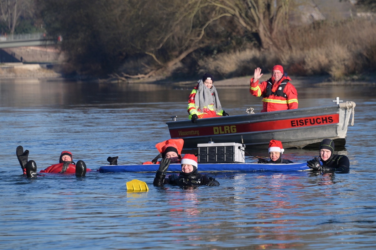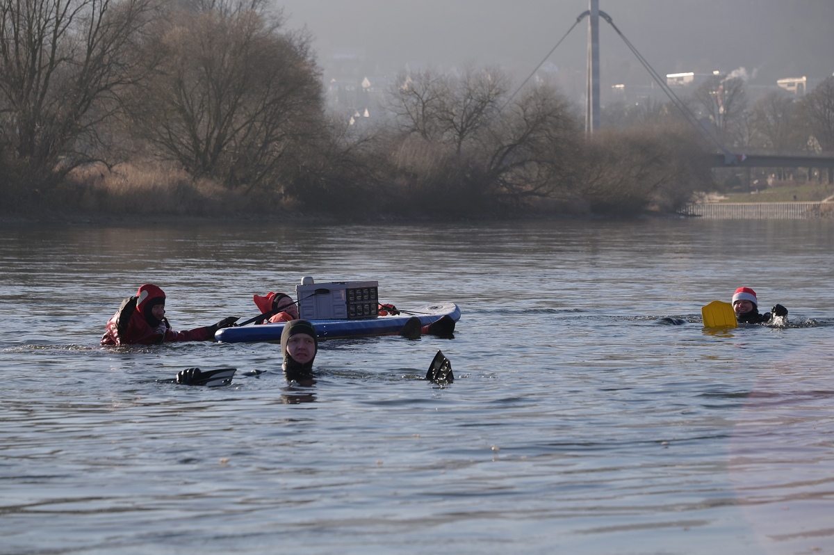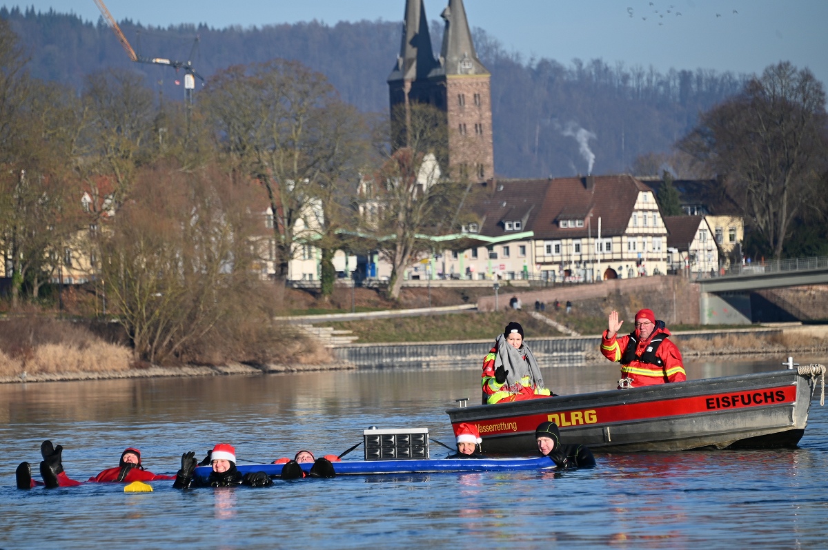 Höxter (TKu). Frohe .Weihnachtsgrüße aus der Weser: Bei klirrender Kälte und winterlicher Kulisse haben sich fünf Rettungsschwimmerinnen und -schwimmer der DLRG Ortsgruppe Höxter am zweiten Weihnachtsfeiertag am traditionellen Weihnachtsschwimmen in der Weser beteiligt. Mit Weihnachtsmützen auf dem Kopf, heißem Getränk in einer großen Thermoskanne auf einem mitgeführten Floß und geschützt durch Neopren- und Tauchanzüge wagten sich die Teilnehmenden in die eiskalten Fluten der Weser. Die rund 5,5 Kilometer lange Strecke führte die Schwimmerinnen und Schwimmer von der Nethemündung bei Godelheim bis zu ihrem Ausstiegspunkt in Höhe der Weserscholle in Höxter. Sicherheit hatte auf der Reise oberste Priorität: Ein DLRG-Rettungsboot begleitete sie über die gesamte Distanz in dem etwa sechs Celsius Grad kalten Weserwasser. Für viele Spaziergänger entlang der ufernahen Wege bot sich ein außergewöhnliches Bild.