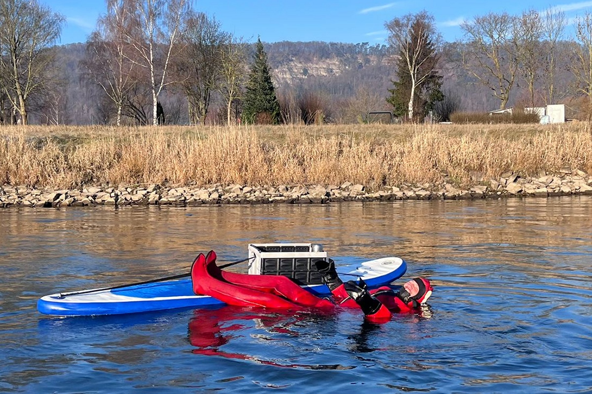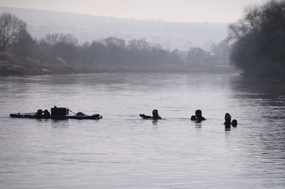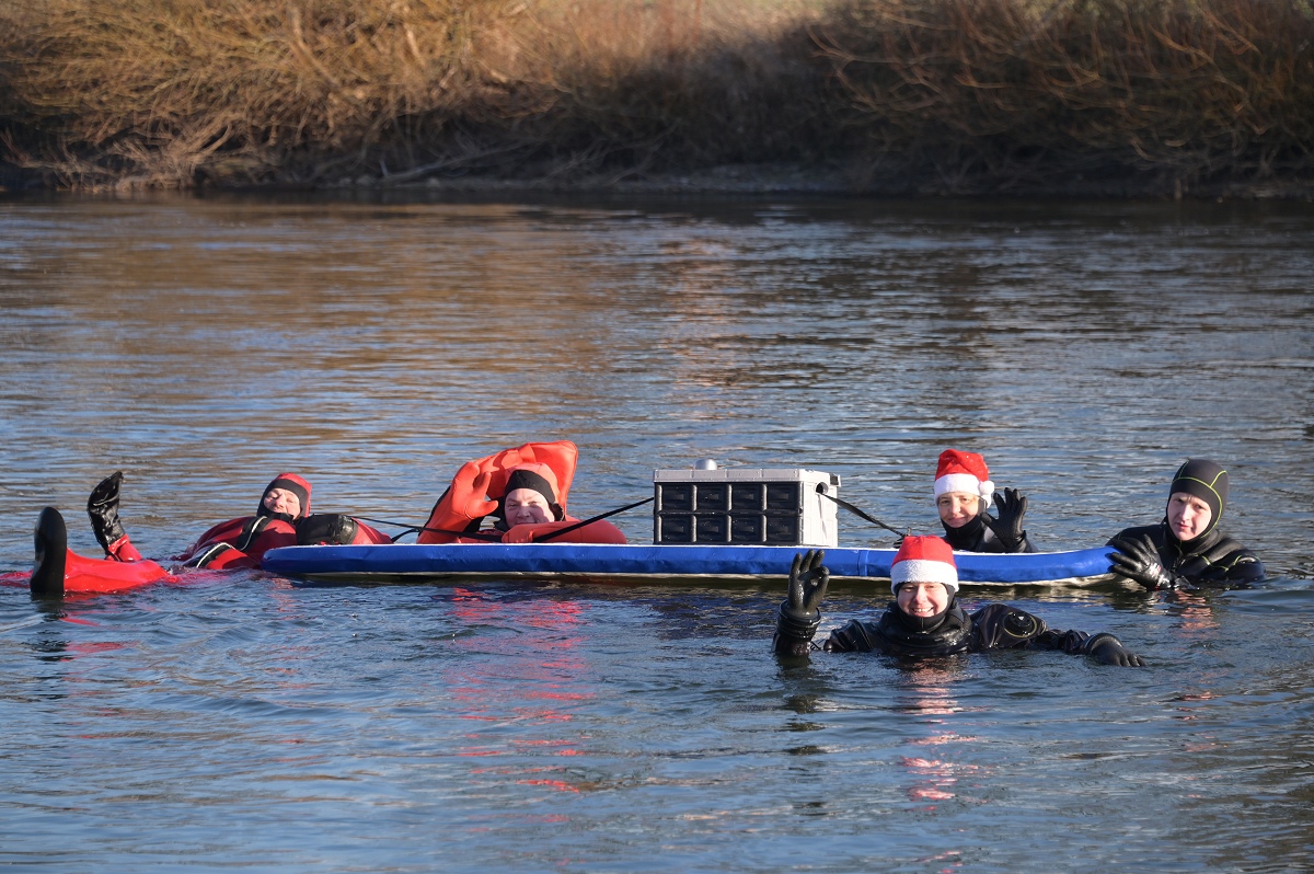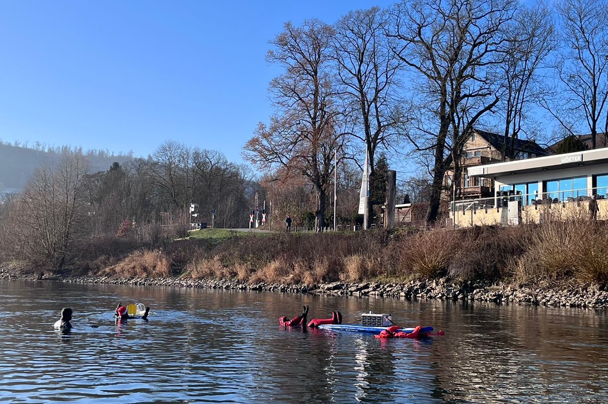 Höxter (TKu). Frohe .Weihnachtsgrüße aus der Weser: Bei klirrender Kälte und winterlicher Kulisse haben sich fünf Rettungsschwimmerinnen und -schwimmer der DLRG Ortsgruppe Höxter am zweiten Weihnachtsfeiertag am traditionellen Weihnachtsschwimmen in der Weser beteiligt. Mit Weihnachtsmützen auf dem Kopf, heißem Getränk in einer großen Thermoskanne auf einem mitgeführten Floß und geschützt durch Neopren- und Tauchanzüge wagten sich die Teilnehmenden in die eiskalten Fluten der Weser. Die rund 5,5 Kilometer lange Strecke führte die Schwimmerinnen und Schwimmer von der Nethemündung bei Godelheim bis zu ihrem Ausstiegspunkt in Höhe der Weserscholle in Höxter. Sicherheit hatte auf der Reise oberste Priorität: Ein DLRG-Rettungsboot begleitete sie über die gesamte Distanz in dem etwa sechs Celsius Grad kalten Weserwasser. Für viele Spaziergänger entlang der ufernahen Wege bot sich ein außergewöhnliches Bild.