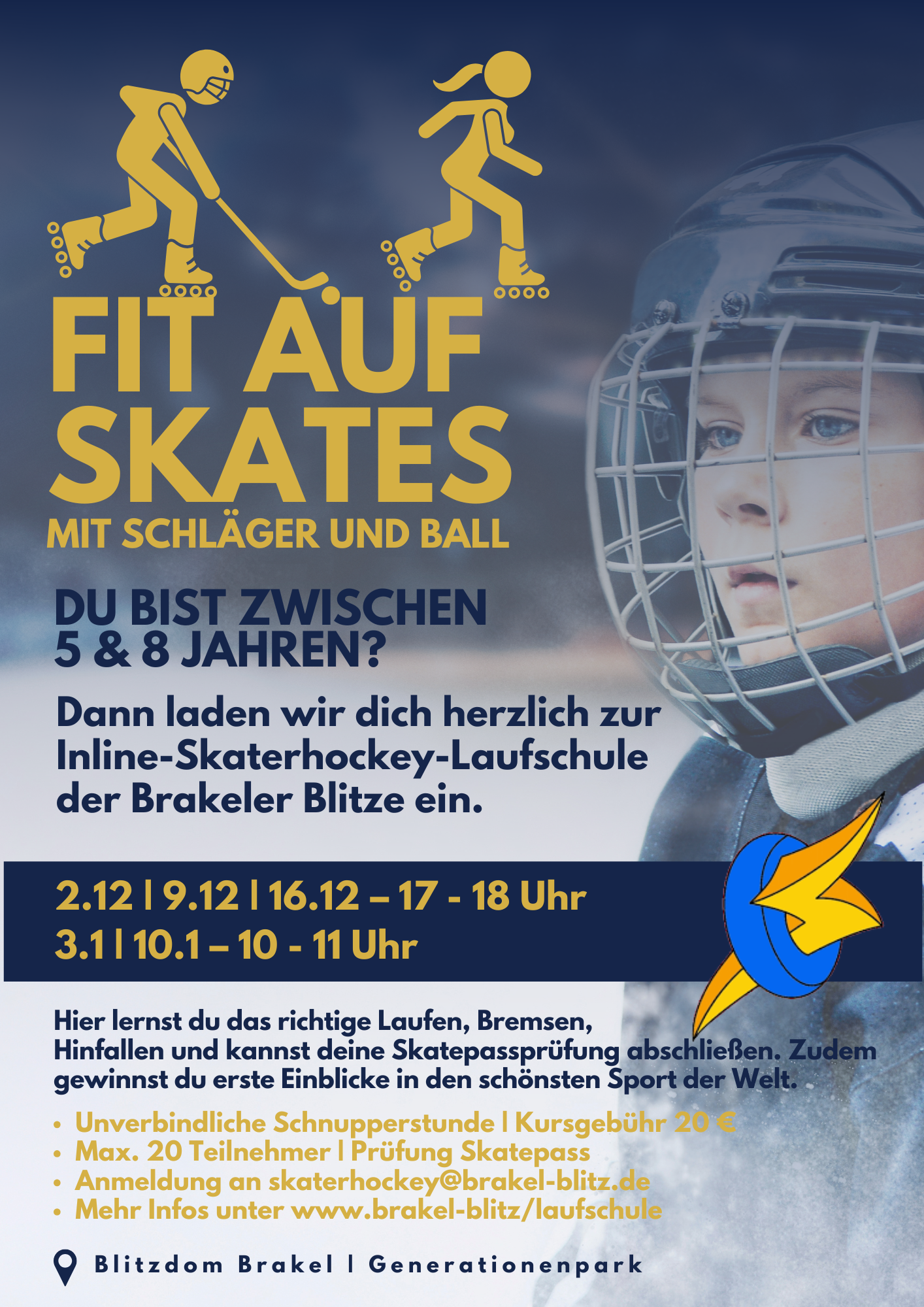 Brakel (red). Unter diesem Motto bieten die Blitze vom Turnverein Brakel wieder ihre beliebte Inlineskaterhockey Laufschule in der Halle im Generationenpark Brakel an. Kinder zwischen 5 und 8 Jahren lernen am 2., 9. und 16. Dezember von 17 bis 18 Uhr sowie am 3. und 10. Januar von 10 bis 11 Uhr das sichere Laufen, Bremsen und Hinfallen auf Inlineskates. Außerdem gewähren die ausgebildeten Trainer Einblicke in den schönsten Sport der Welt. Die maximal 20 Teilnehmer beschließen den Kurs am 10. Januar mit der ersten Prüfung zum Skatepass.